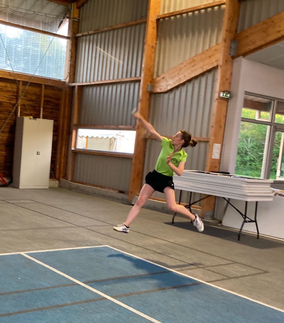 La magnifique salle de Saint Pierre de Chignac (Dordogne) a inspiré Clarisse pour le cinquième TRJ les 6 et 7 mai. Elle termine seconde du Top D en simple dame, en s'inclinant de très peu contre la gagnante (19/21 au troisième set). Clarisse remporte le Top C en double dame avec Cyrielle (comité 19) : félicitations à notre benjamine. Vous la trouverez facilement sur les photos grâce au maillot vert de la rainette !!!
