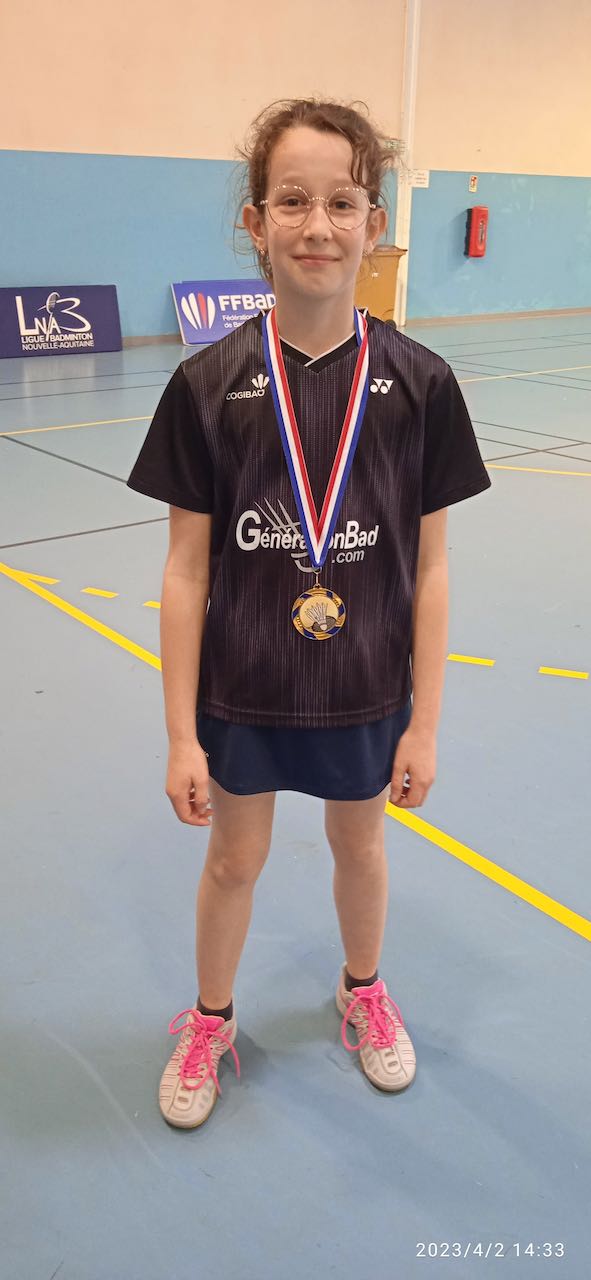 Le lendemain, le 2 avril j’étais toujours avec le Cogibad pour le retour de la coupe Nouvelle Aquitaine. Nous avons joué contre le comité 86 et le comité 19. J’ai pu jouer 2 doubles, 1 mixte et 1 simple. J’ai remporté tous mes matches sauf un double en 3 sets. Nous étions fortement et bruyamment encouragés par nos parents et mes coéquipiers. Nous avons battu le comité 86, 11 matchs à 0 sans perdre de match. Nous avons gagné le comité 19, 8 matches à 3, c'était un peu plus serré que les autres rencontres. Nous avons remporté la Coupe Nouvelle Aquitaine, j’ai reçu une belle grosse médaille d’or et un trophée pour les coachs. J’ai beaucoup aimé faire la Coupe Nouvelle Aquitaine car nous étions en groupe.