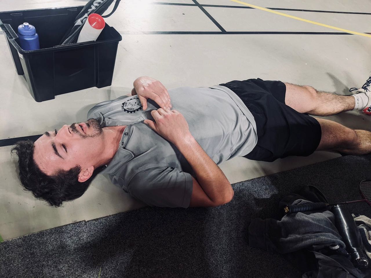 Vient le tour d’Alexis convoqué peu de temps avant 12h, lui ayant déjà une épreuve de nuit dans les pattes à s’occuper de sa petite, il était parti pour ses 3 matchs de simple en série 5. Premier match compliqué, difficile de se mettre dedans et de bouger avec le manque de sommeil. Malgré tout, notre rainette a tout donné (la preuve en image) et réussit à arracher le dernier match de poule! Ouf il ne s’est pas déplacé pour rien!