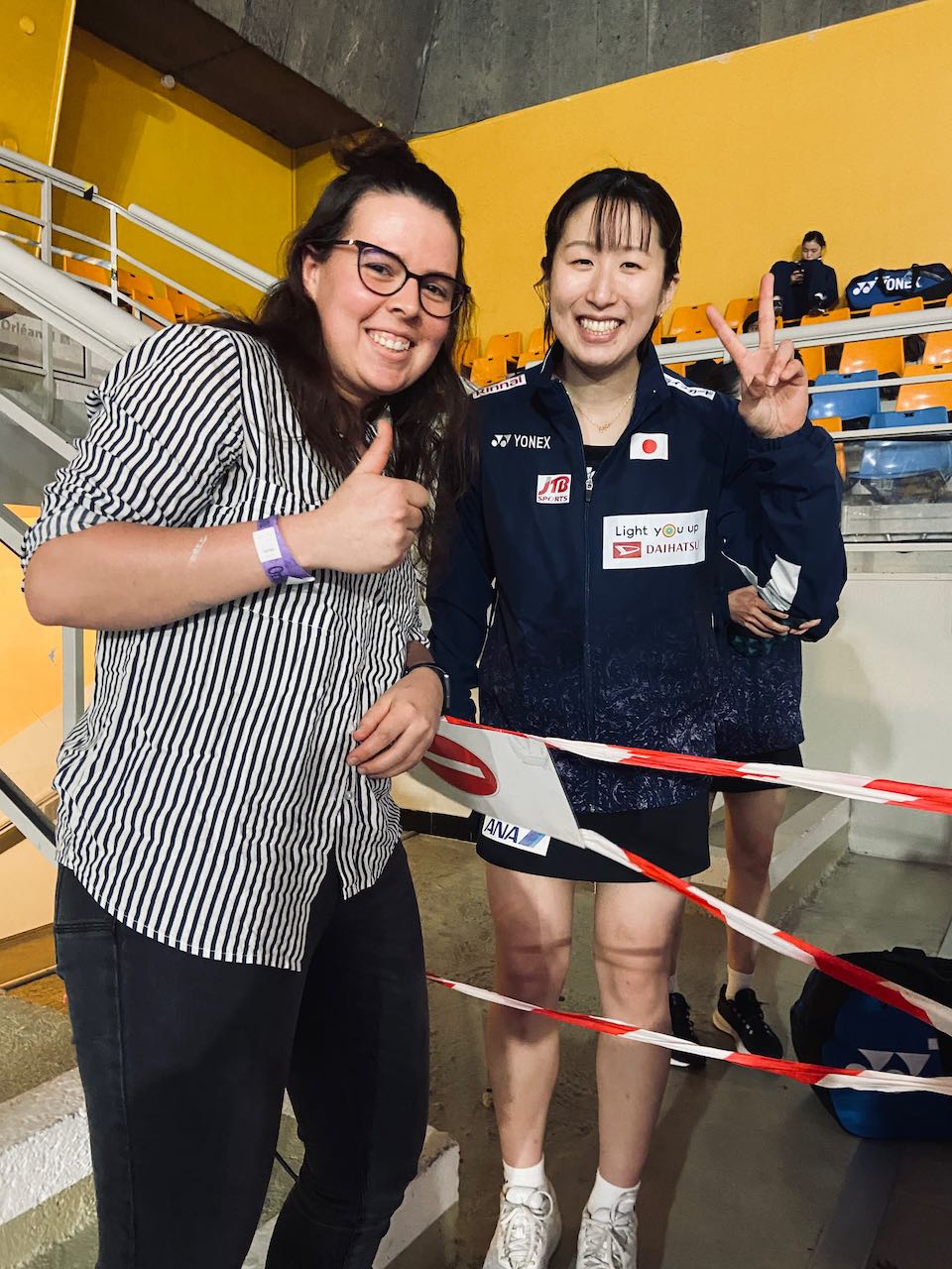 Rendez vous pris le lendemain matin vers 10h, chouette on peut visiter la ville ou dormir un peu. Enfin pas tout le monde. Le dimanche, une rainette s'est levée tôt pour nous rejoindre au palais des sports, miss Anaïs. On rentre tranquillement cette fois-ci, on en profite aussi pour faire quelques emplettes. On est impatients de voir les finales. On sent que les matchs vont être très disputés. On commence par le mixte qui est remporté par un beau duo malaisien Toh Ee Wei et Chen Tang Jie, avec Chen qui était bluffante, même couchée par terre elle renvoie le volant et le point revient aux malaisiens ! Entre chaque match notre duo de fan essaie d’obtenir des autographes et/ou des photos, pas facile avec autant d’enfants devant elles ! Arrive ensuite la finale homme, match très disputé en 3 sets pour 1h08 de jeu. Quelles jambes ! Dans le dernier set, on pensait que le danois Magnus Johannesen allait l'emporter car l’Indien Priyanshu Rajawat commençait à montrer des signes de fatigue. Et bien on avait tort: victoire pour Priyanshu Rajawat ! Place au double dame, malheureusement c' était pendant l’heure du repas, donc chacun notre tour on a pu savourer le match à la télé de la buvette, surtout Fred. On a réussi à tous voir la fin ensemble car le match a duré 1h18. Les gagnantes Rena Miyaura et Ayako Sakuramot qu’on a beaucoup aimées que ce soit pour le jeu ou humainement, nous ont bien montré comment on défendait car en face ça attaquait fort. Le double homme était serré mais les chinois ont résisté et gagné face à nos chouchous indonésiens Fikri et Maulana. Voici venu le dernier match, il était tant attendu. l'ex championne olympique rentre sur le terrain. 1er set très serré, Carolina arrive à le gagner 25/23. Au 2ème set les points ont défilé pour l'américaine B.Zhang qui le remporte haut la main et sans trop d’opposition. 3ème set Carolina se remet dedans et le gagne assez largement 21/10. Visiblement ravie de remporter un super 300 après tant d'efforts pour revenir suite à deux opérations aux genoux, l'espagnole continuera ses dédicaces et photos avec nous !!